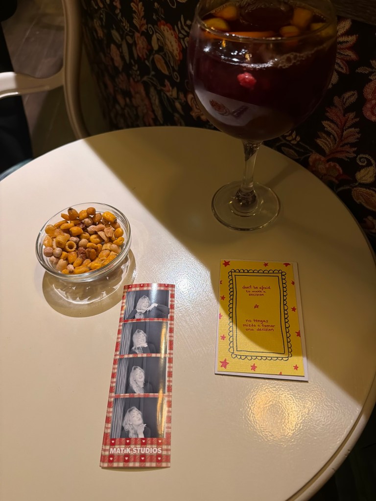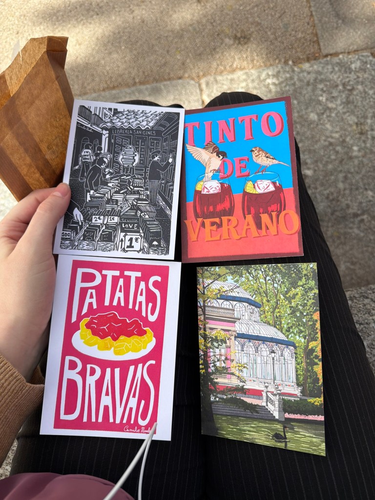 And here we are at today, my final day in the lovely city of Madrid. The first thing I did was visit Chocolateria San Gines to get their famous Chocolate con Churros with an old friend from back home. It was so nice to catch up and also hear about her experience going to college here. Tired from my full week I took an afternoon siesta before hitting the city again and grabbing dinner at Mad Mad Vegan. I got their vegan calamari, a club sandwich, and a glass of vermouth and it all hit the spot. Satisfied and tired, I ended my day with a night stroll and some window shopping on Gran Via, Madrid’s main shopping street.
