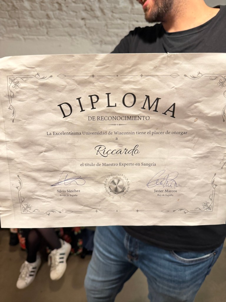 And finally, I ended this long day at my hostel’s free sangria making night, where I met TWO fellow Wisconsinites, and the hostel leader presented his fake “Master of Sangria” Diploma from the University of Wisconsin signed by the King and Queen of Spain (the two front desk receptionists lol). After some chatting, he revealed that of course the Diploma was a joke and the hostel picked the University of Wisconsin randomly, assuming they might never meet someone from the state of WI. It was absolutely hilarious.